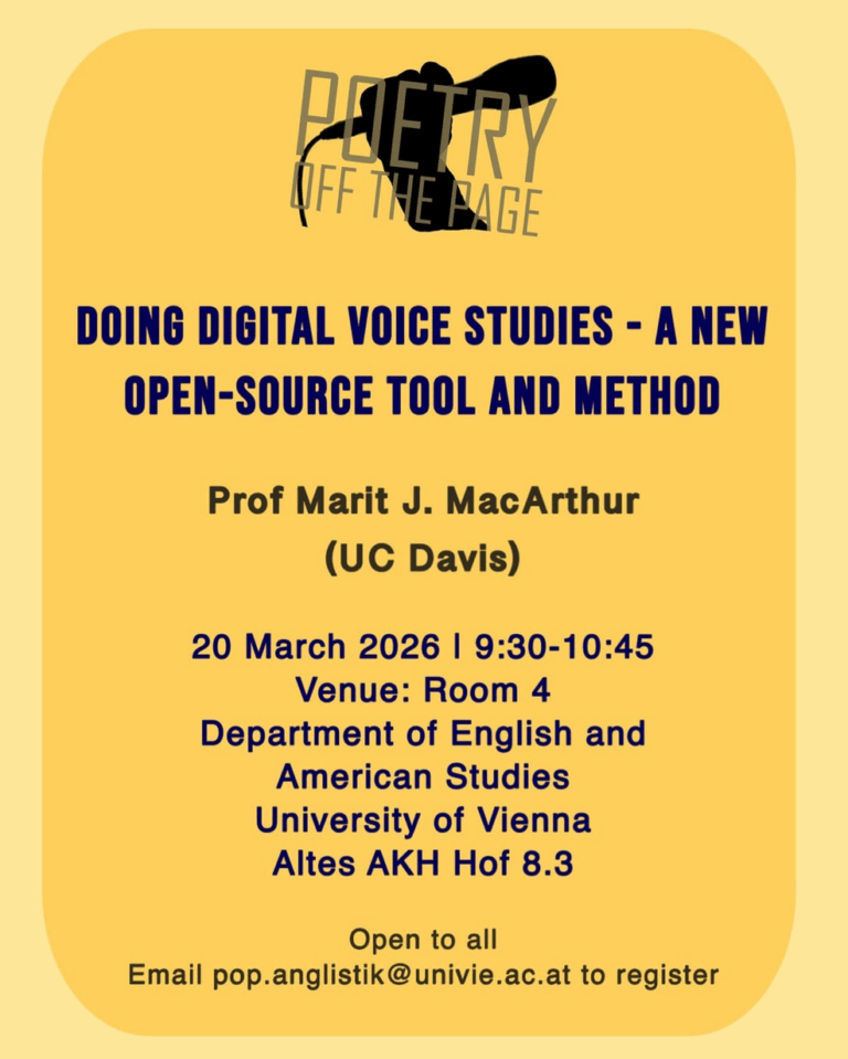 “Poetry Off the Page” is a five-year project, directed by Dr. Julia Lajta-Novak (University of Vienna), in collaboration with the British poetry organisation Apples and Snakes, the Royal Central School of Speech and Drama, Goldsmiths University of London, Queen Mary University of London, University College Dublin, and the National Library of Ireland. It is supported by an ERC Consolidator Grant and the START-Prize of the Austrian Science Fund (FWF).